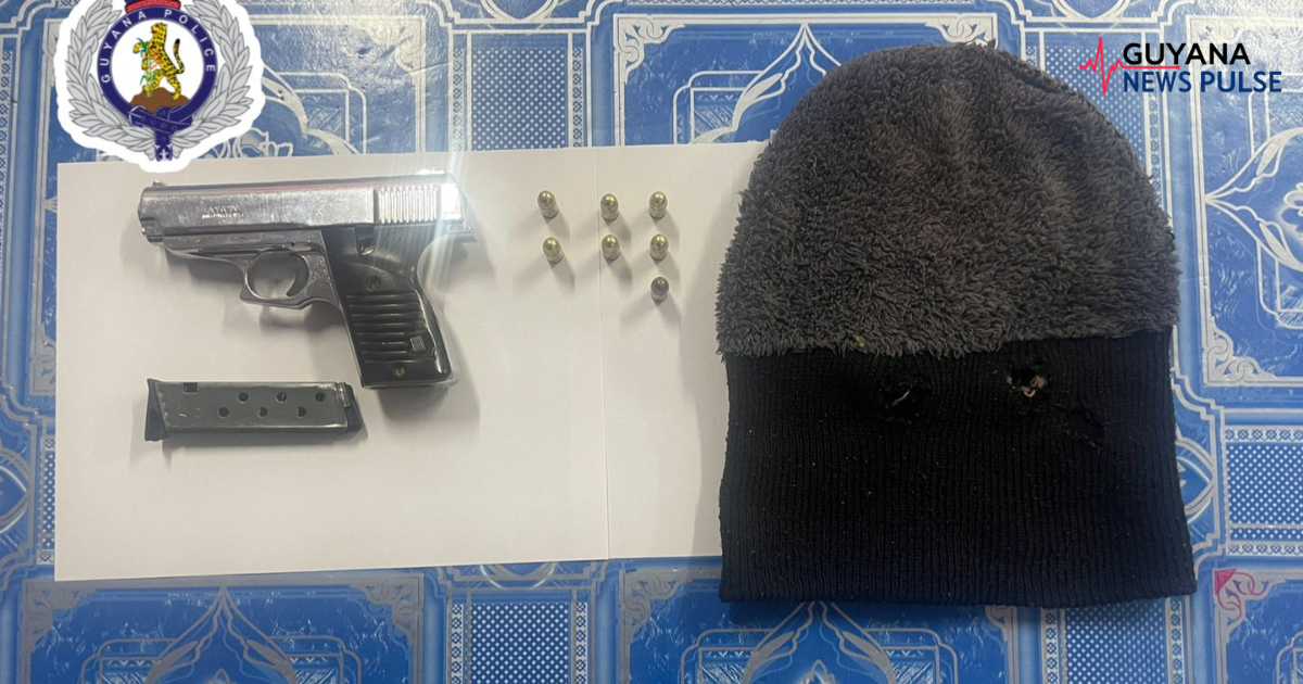 The driver was arrested and taken, along with the vehicle, to the Turkeyen Police Station, where the car was searched in his presence. During the search, police said they found a black ski mask containing a silver and black .380 Lorcin pistol along with seven rounds of .380 ammunition.